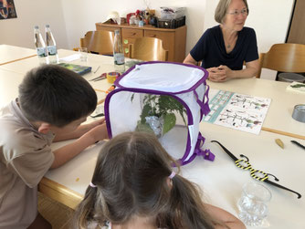 Kita-Naturbotschafter Wolfgang Reich erklärte den Kindern, wie sich Schmetterlinge aus Eiern, Larven und Puppen zum fertigen Insekt entwickeln. Zur besseren Anschauung brachte er verschiedene Entwicklungsstadien mit der Futterpflanze Brennnessel mit. Da recht viele Schmetterlinge von der Brennnessel leben, lohnt es sich, sie im Garten stehen zu lassen und nach Raupen Ausschau zu halten. Die Augen der Schmetterlinge sind aus sehr vielen kleinen Einzelaugen zusammengesetzt. Um davon eine Vorstellung zu bekommen, bastelten die Kinder Brillen, die dieses Prinzip darstellten. Zum Abschluß gab es noch ein Bild zum Ausmalen.